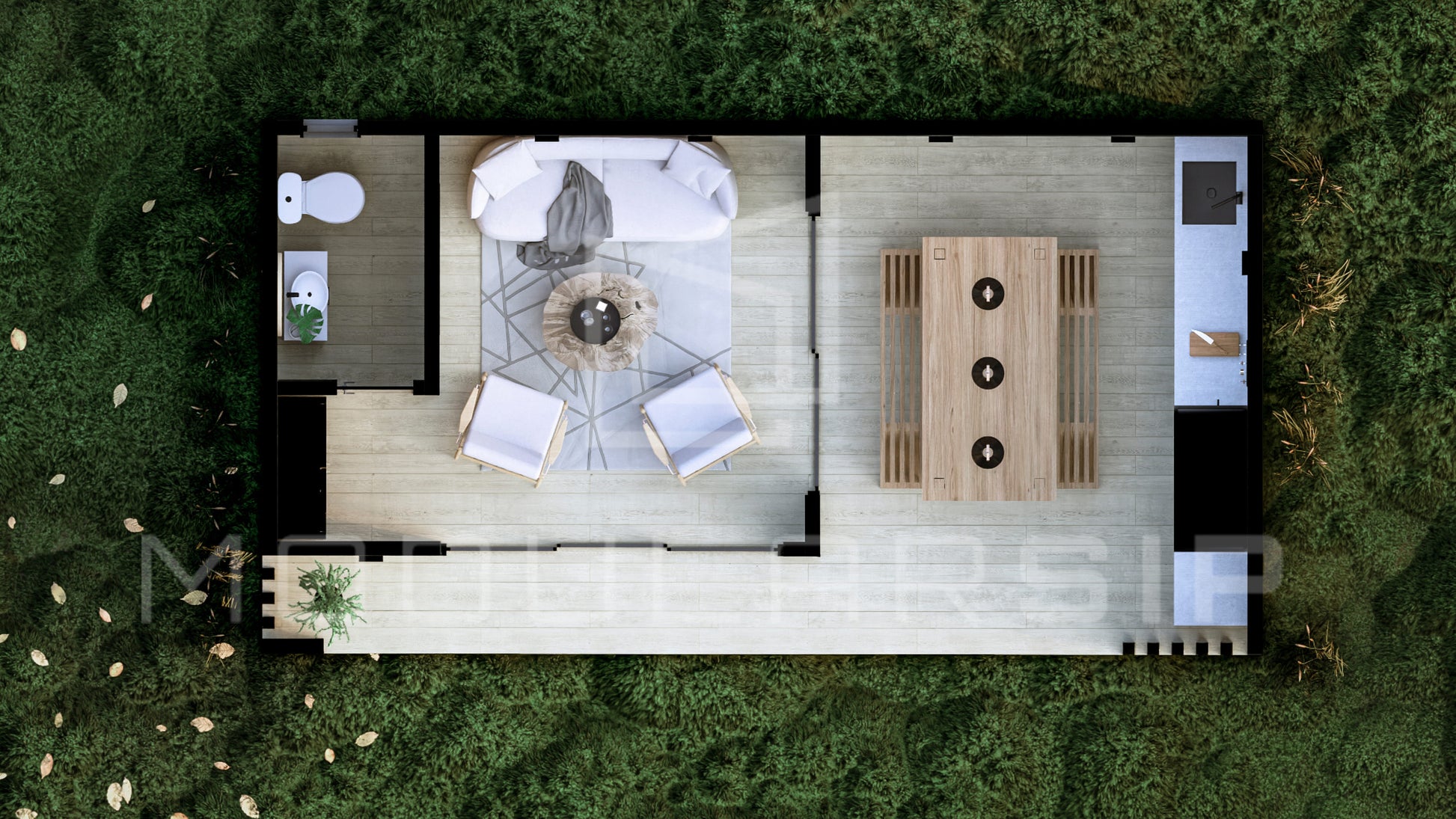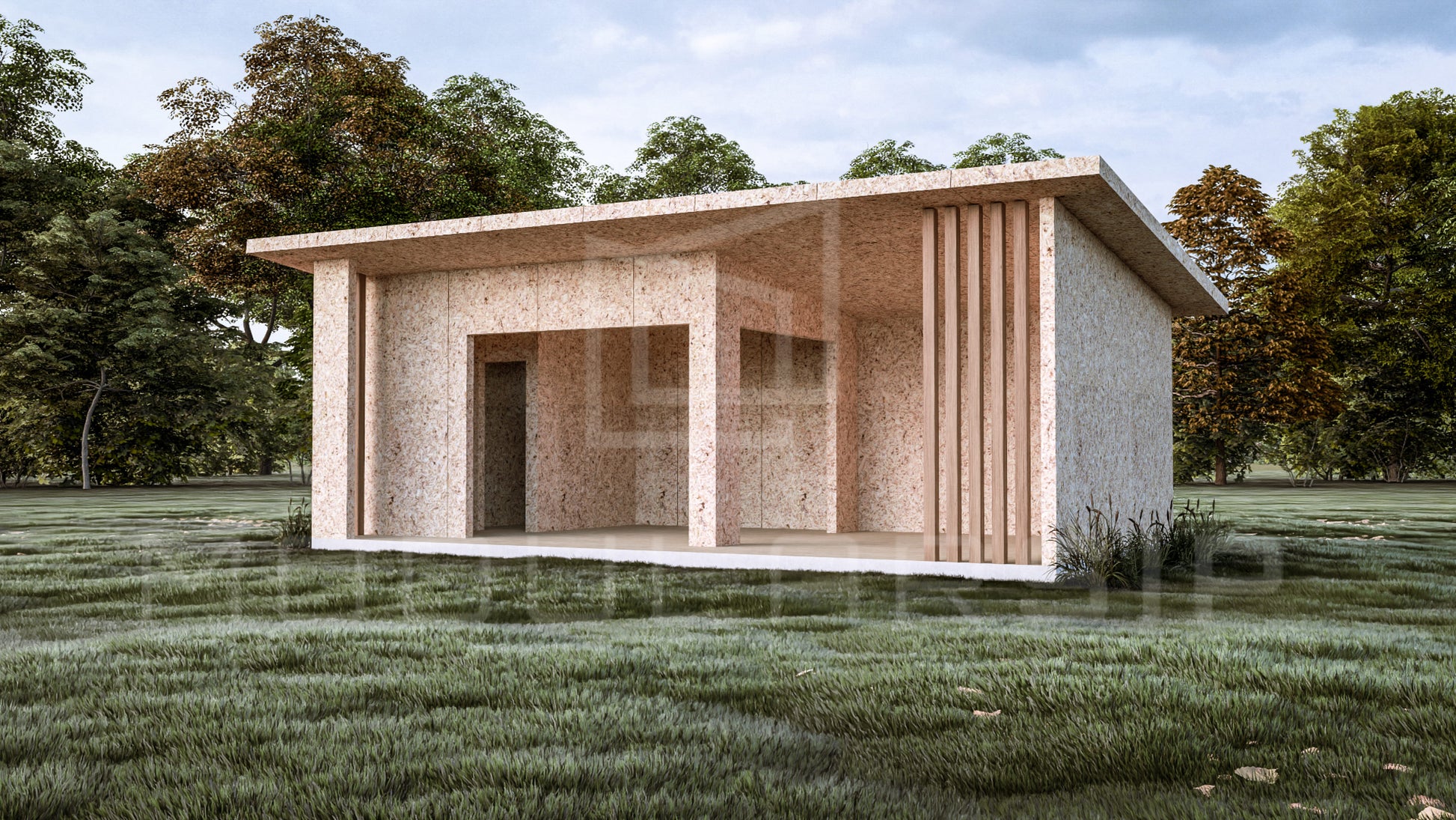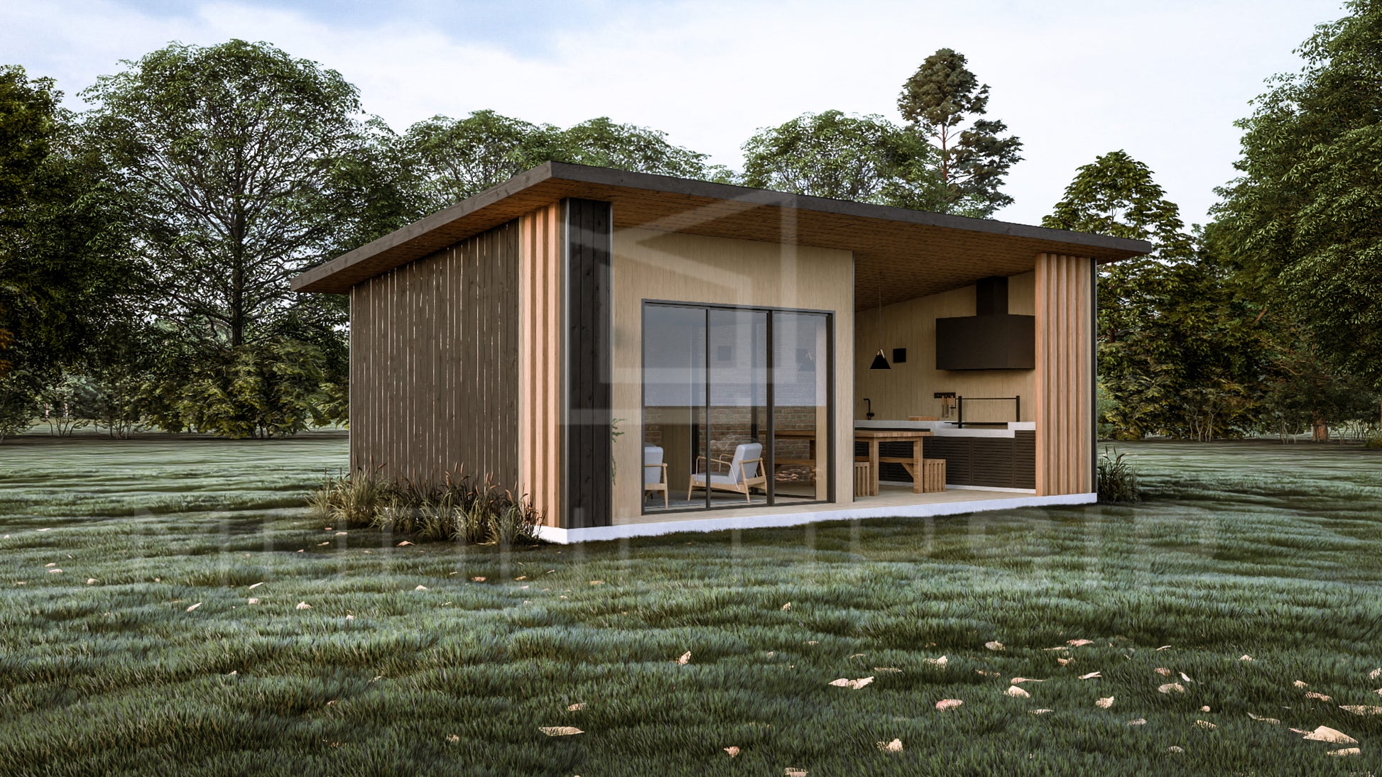 Este Quincho de 35 metros cuadrados con techo inclinado de Modular SIP con espacio interior con baño y gran espacio exterior, es un concepto de diseño funcional que cumple con todas las necesidades para disfrutar con toda la familia y amigos